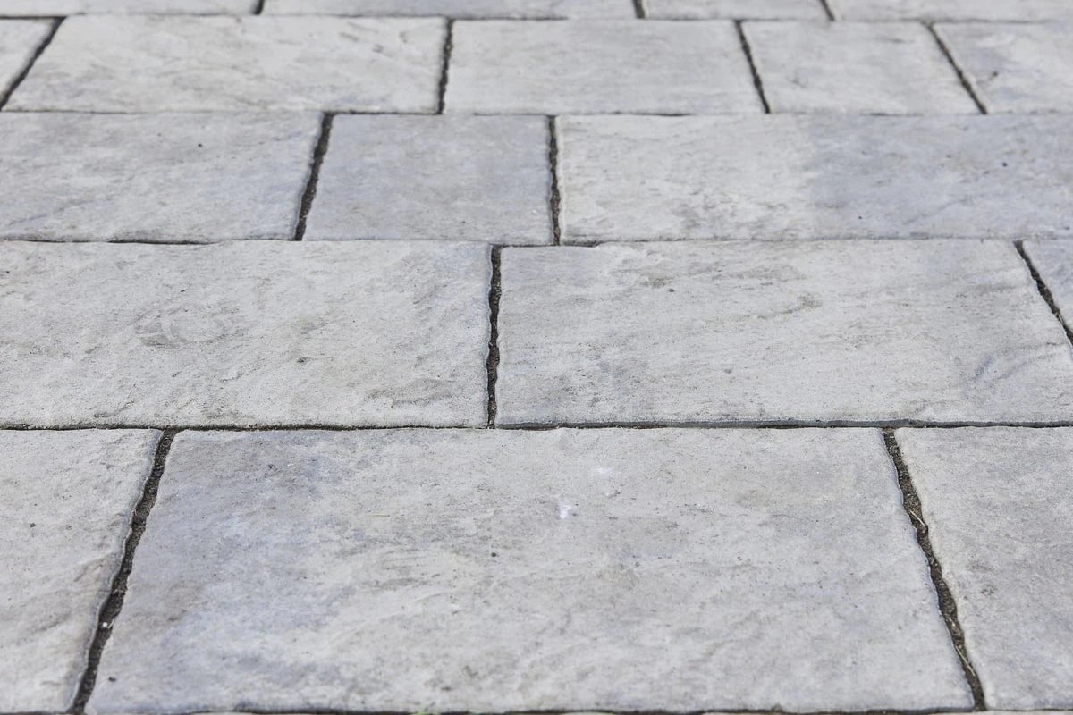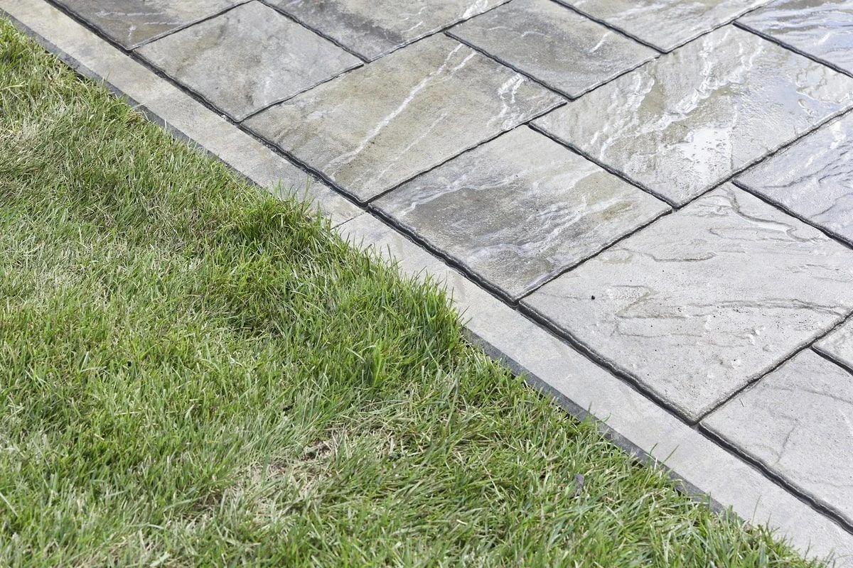 Четкие линии самой плитки дополняют геометричность укладки, делая территории еще более аккуратной. По краям от дорожек местами высажены цветы и поставлены ландшафтные украшения, которые также украшают общий дизайн в едином минималистичном стиле.