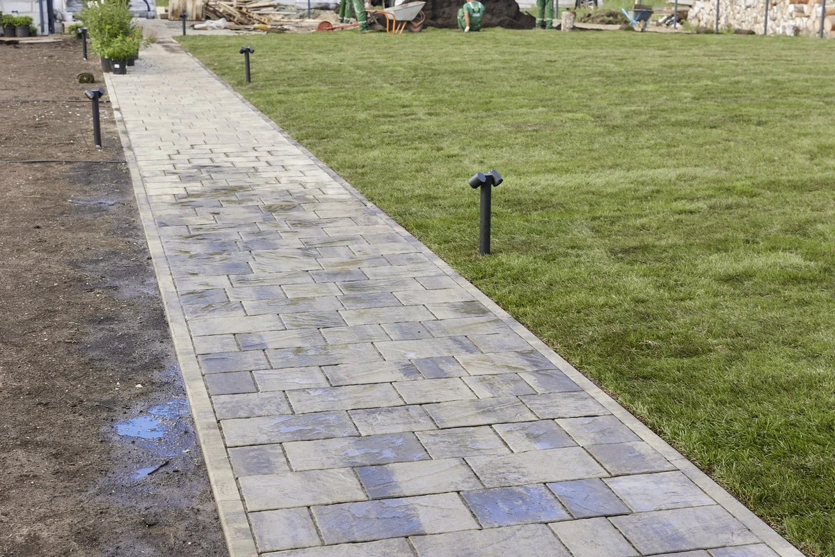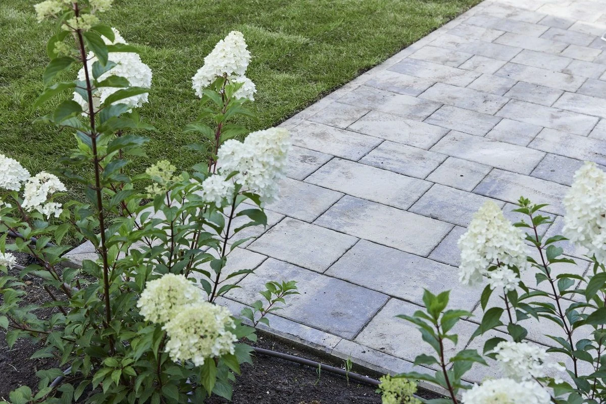 Для этих работ идеально подошли тротуарная плитка Литос в цвете Шунгит, а также бордюры в этом же цвете. Дорожки выполнены в строгом геометрическом формате с прямыми углами, ширина выбрана таким образом, чтобы как минимум два человека могли с легкостью идти рядом или разойтись на дорожке.